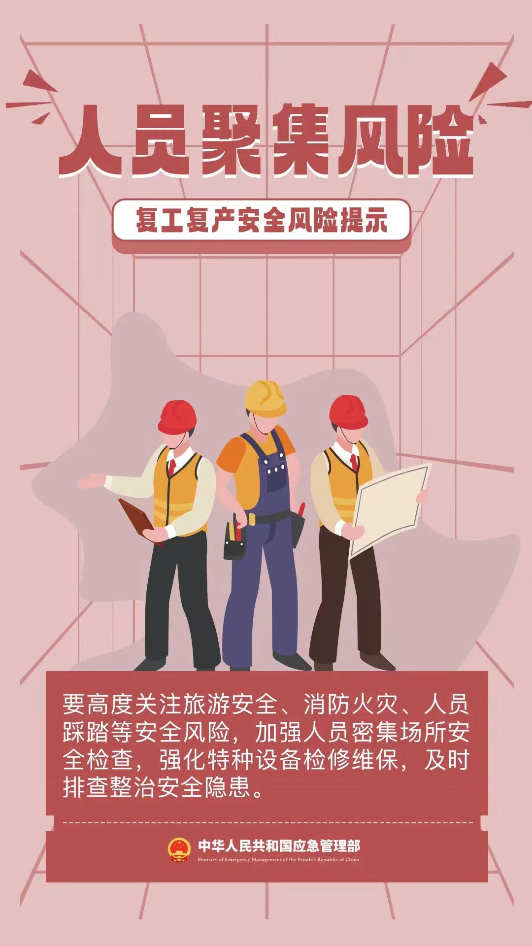 春節假期結束,各工程項目陸續開始復工復產,安全防范不可疏忽大意。下面帶領大家來了解并盤點一下關于復工復產時期的主要危險因素及應對辦法。復工復產時期主要危險因素:1.假期綜合征受假期影響,人雖然回到工作崗位了,但思想不集中,這就是“假期綜合征”。其危險之處就在于職工身心疲憊、心情煩躁、精力不集中,很容易